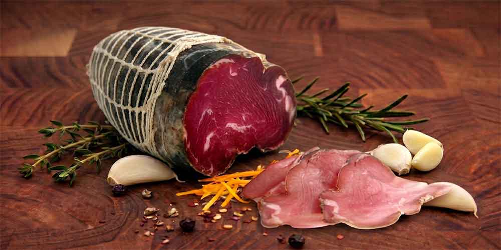 Lamb Prosciutto: Center cut lamb top round seasoned with rosemary and wine. It is cured and let to rest until it is ready to be sliced. The name comes from the fact that this product should be sliced thinner than paper by the string of a violin.